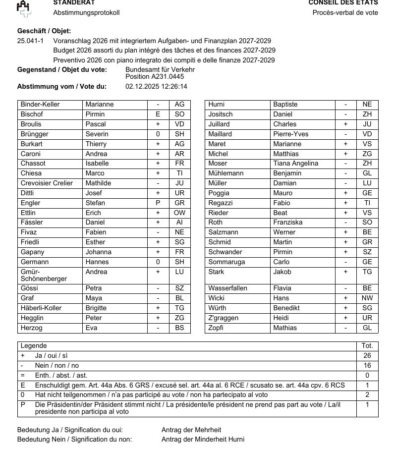 Abstimmungsergebnis im Ständerat am 2. Dezember 2025.